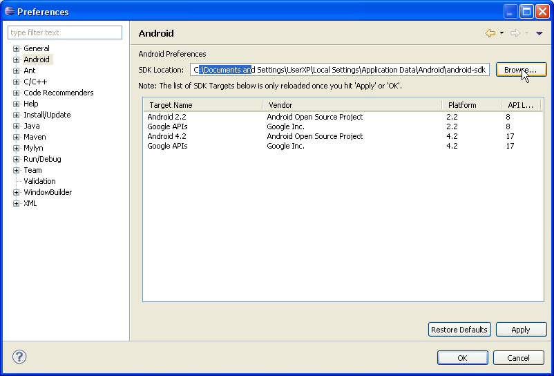 Sol menüden Android tıklayın. Eğer Android SDK seçilmemişse Browse diyerek yüklediğiniz Android SDK klasörünü belirtin.